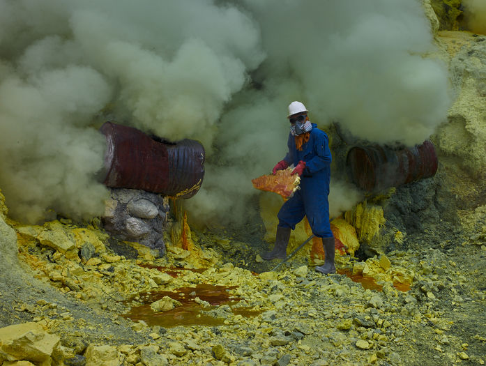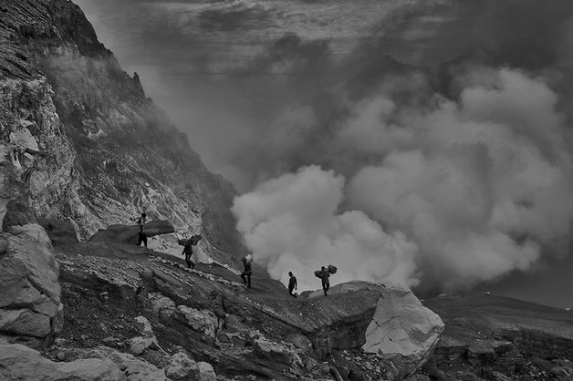 In the crater, hundreds of sulfur miners worked under brutal conditions. With bare hands and simple tools, they carved hardened sulfur from the earth, breathing in toxic fumes with little protection. Then, with 60–90 kg strapped into bamboo baskets across their shoulders, they climbed 180 meters out of the crater and trekked another 3.8 km down winding paths. All for around 10 cents per kilogram — barely more than US$12 a day.